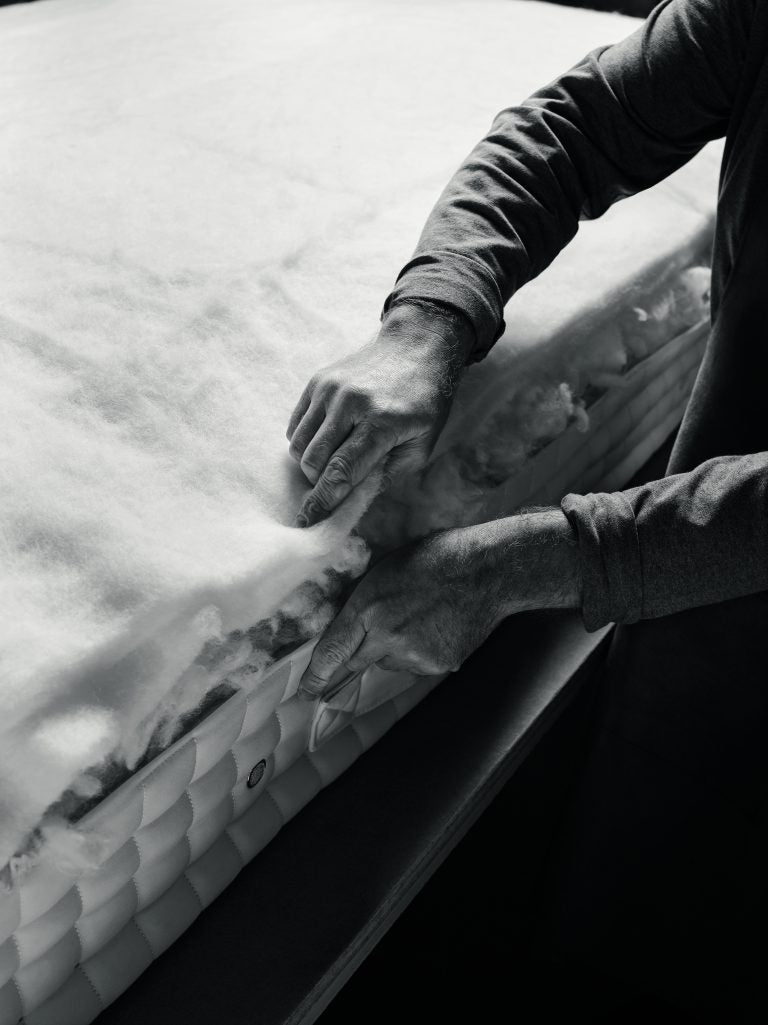 Käytämme eri puolelta maailmaa ylellisimpiä ja kestävimpiä luonnonmateriaaleja. Se on ainoa tapa varmistaa, että Vispring-mukavuus ylittää kaiken, mitä olet kokenut. Pehmeä, untuvainen, luomoava ja satiinimainen. Jokainen materiaalia käsitellään huolellisesti. Käsin tuftattu. Huolellisesti täytetty. Ylellisesti viimeistelty, näistä syntyy Vispring vuoteet.